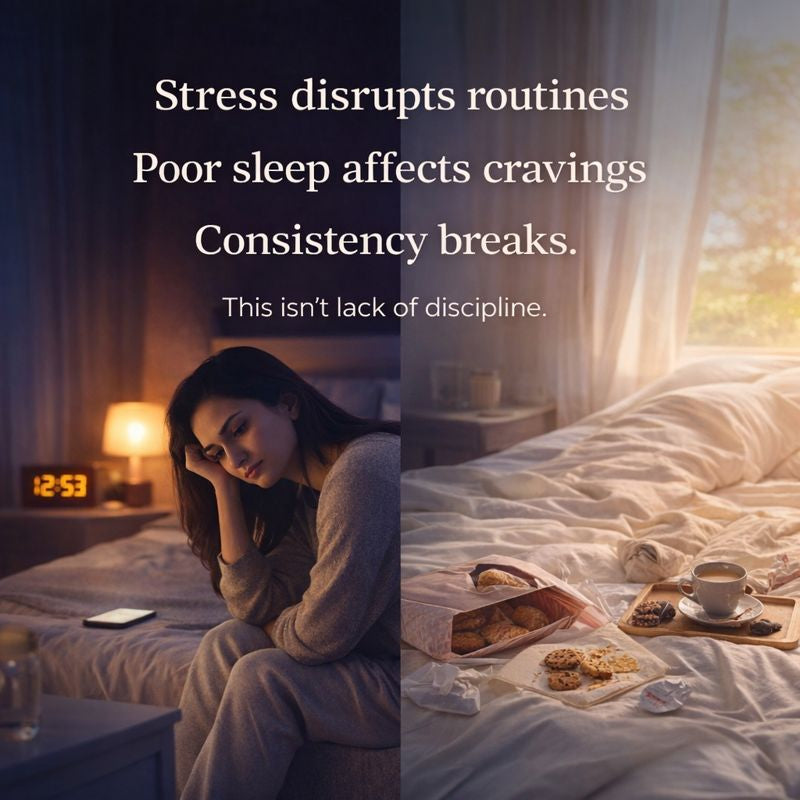 Stress and poor sleep quietly affect cravings, energy, and routine consistency.